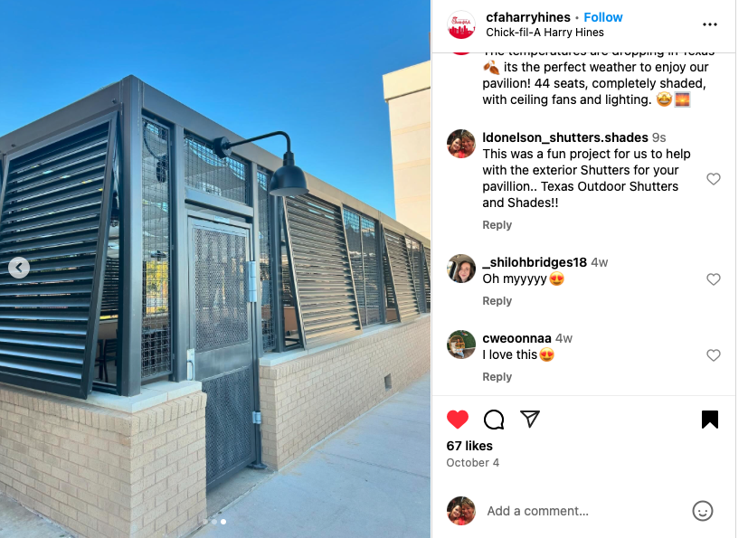 Enhanced Security: Recognizing Chick-fil-A’s closure on Sundays, Texas Outdoor Shades and Shutters spec’d the locking handles to provide added security to the outdoor pavilion, making these security shutters a key feature for the Chick-fil-A renovation project.
