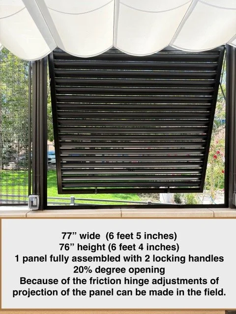 Custom Shutters: A single 77" wide (6 ft 5 in) x 76" height (6 ft 4 in) panel, fully assembled with two locking handles, was installed. Featuring a 20° opening and adjustable friction hinges, the shutters allow for field-customized projection, ensuring versatility for Dallas TX’s diverse weather conditions. The rich bronze color adds a warm, distinctive touch to the custom outdoor shades design, enhancing the commercial shutters installation.